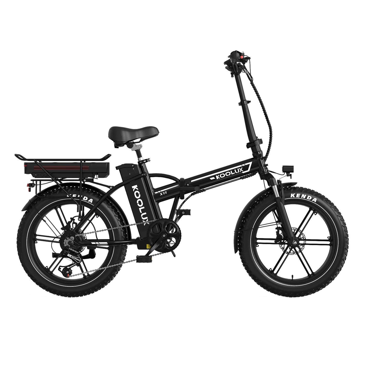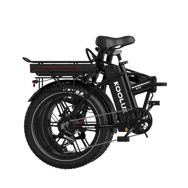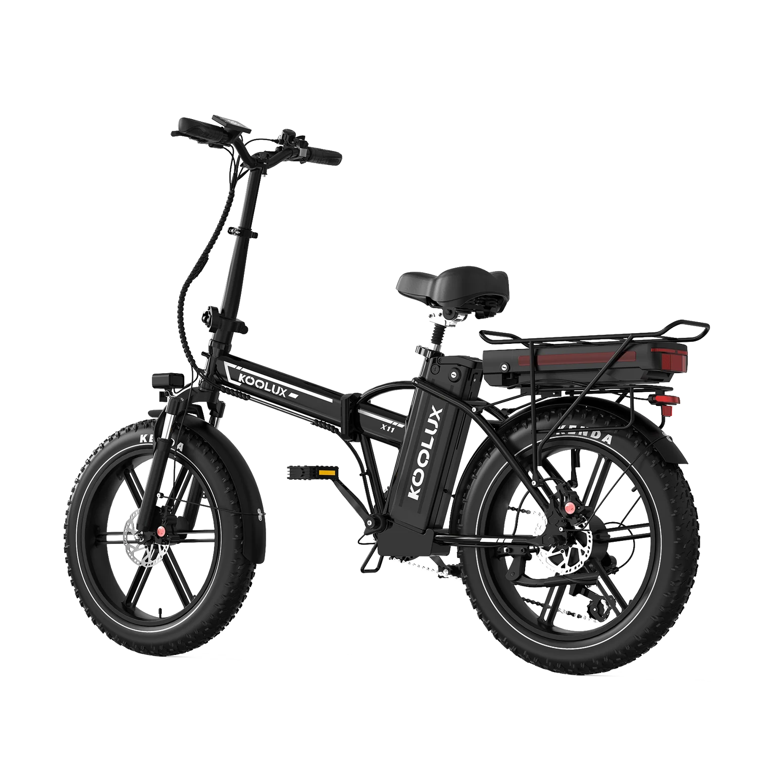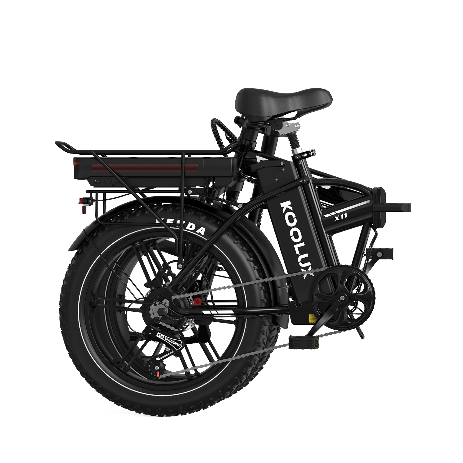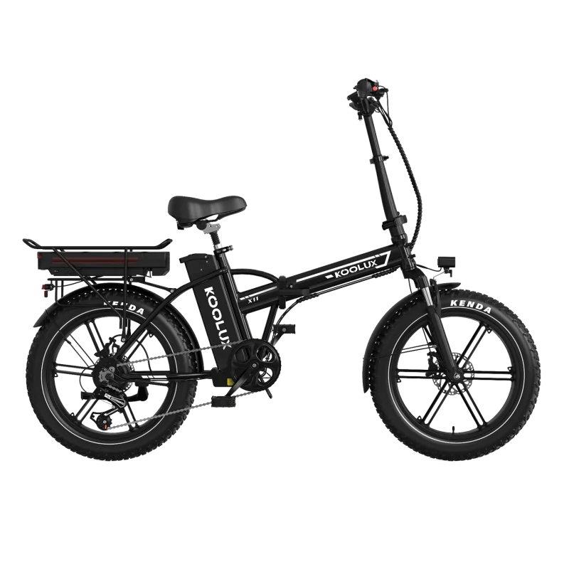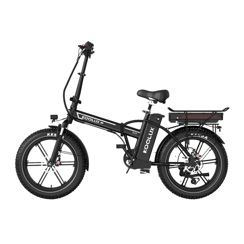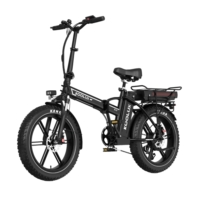 The KOOLUX X11 e-bike comes in a cool black color, blending modern style with reliable performance. Its 750W motor is paired with a high-capacity 48V 13+10.4Ah lithium-ion battery for a range of 80-150 kilometers on a single charge. Whether you’re commuting in the city or exploring scenic routes, the X11’s 20×4.0” built-up tires, fork suspension, Shimano 7-speed shifting system, and hydraulic disc brakes ensure a smooth, safe ride on all types of terrain. An intuitive LCD display and integrated speed sensor keep you informed every step of the way. X11 is built on a sturdy iron frame for strength and durability. With a top speed of 40 km/h unlocked, it’s the perfect companion for city trips and weekend adventures.