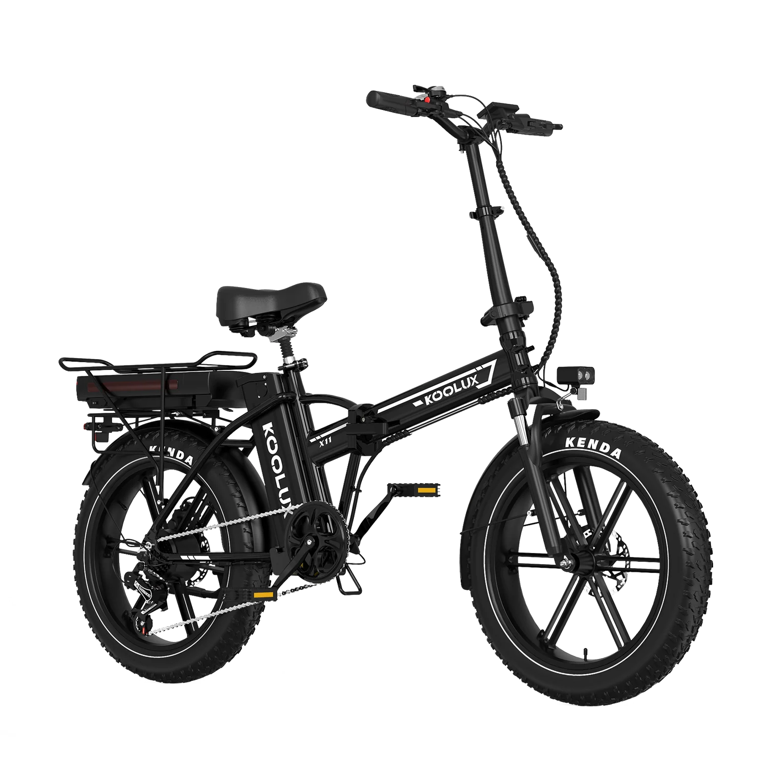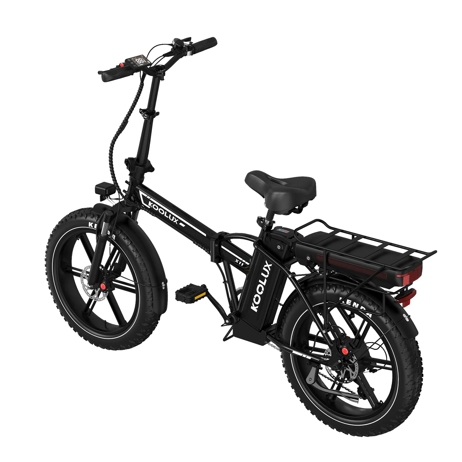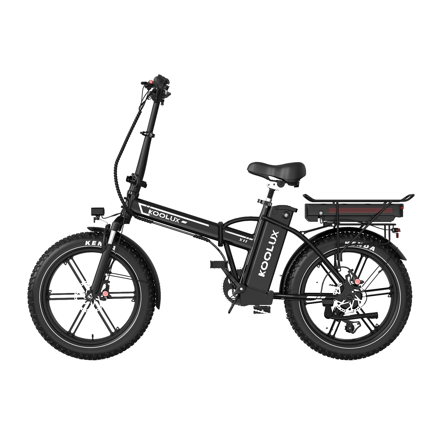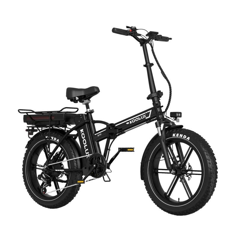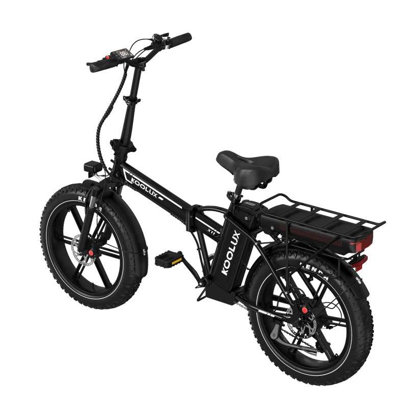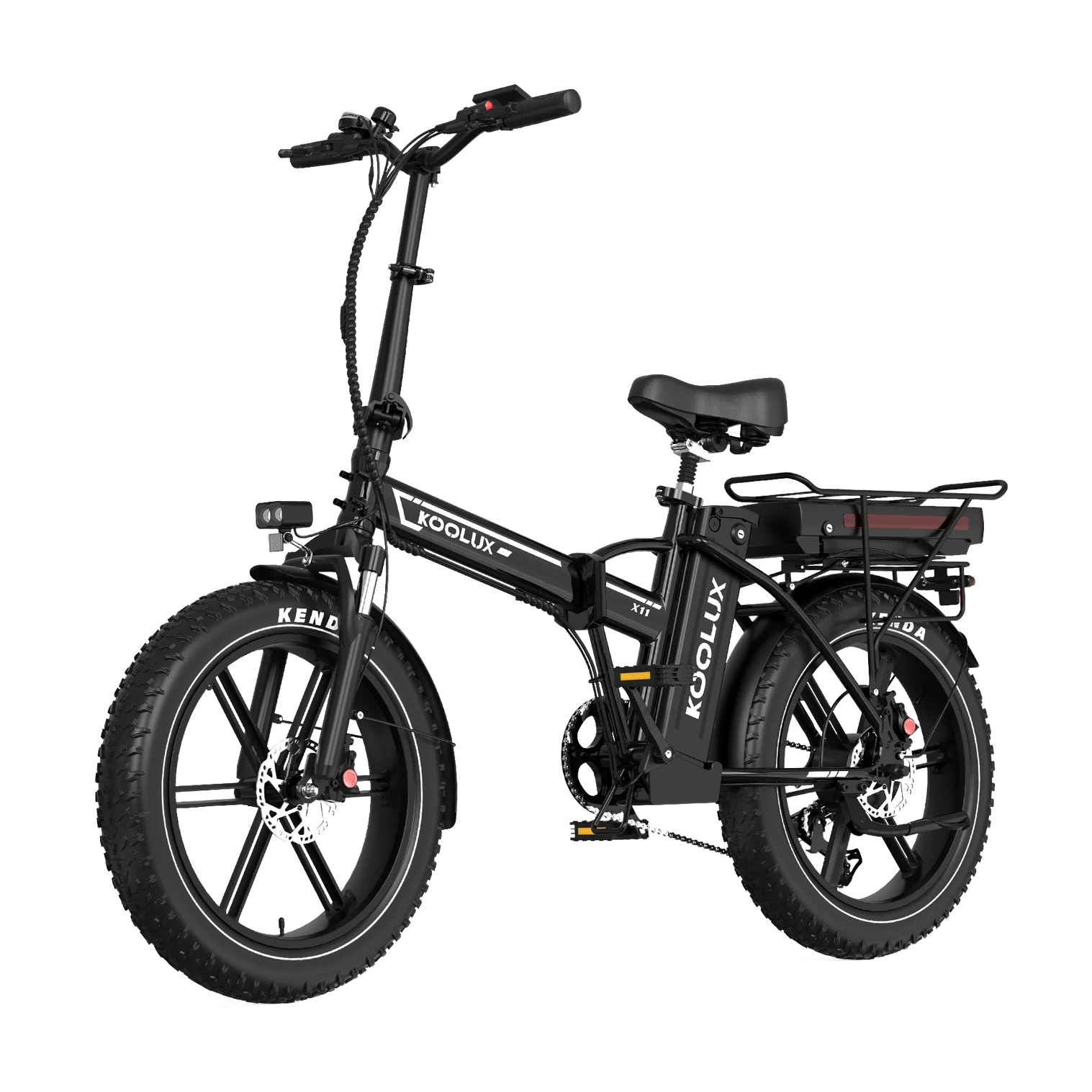 The KOOLUX X11 e-bike comes in a cool black color, blending modern style with reliable performance. Its 750W motor is paired with a high-capacity 48V 13+10.4Ah lithium-ion battery for a range of 80-150 kilometers on a single charge. Whether you’re commuting in the city or exploring scenic routes, the X11’s 20×4.0” built-up tires, fork suspension, Shimano 7-speed shifting system, and hydraulic disc brakes ensure a smooth, safe ride on all types of terrain. An intuitive LCD display and integrated speed sensor keep you informed every step of the way. X11 is built on a sturdy iron frame for strength and durability. With a top speed of 40 km/h unlocked, it’s the perfect companion for city trips and weekend adventures.