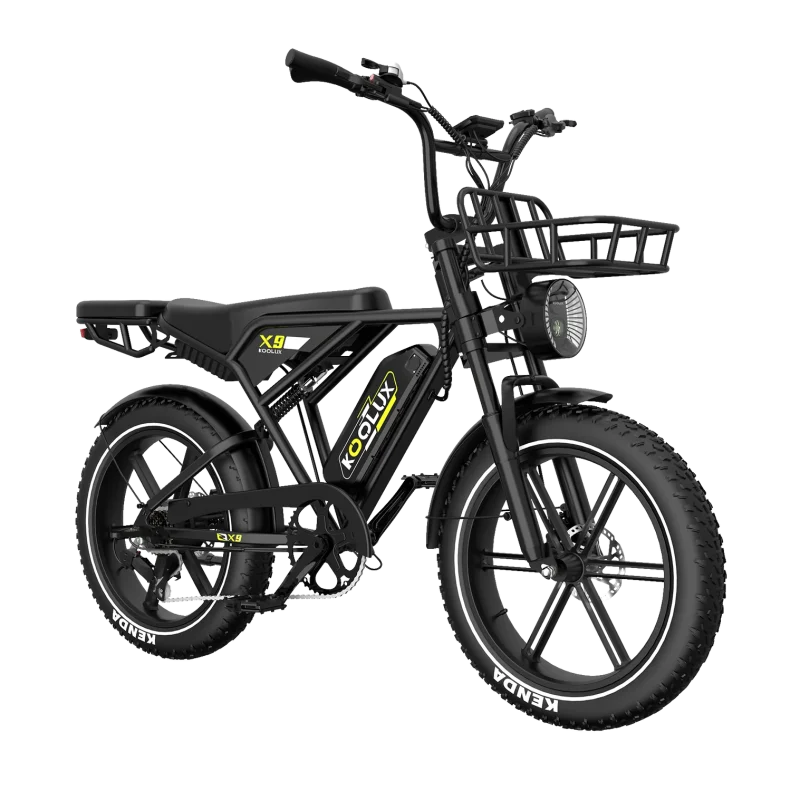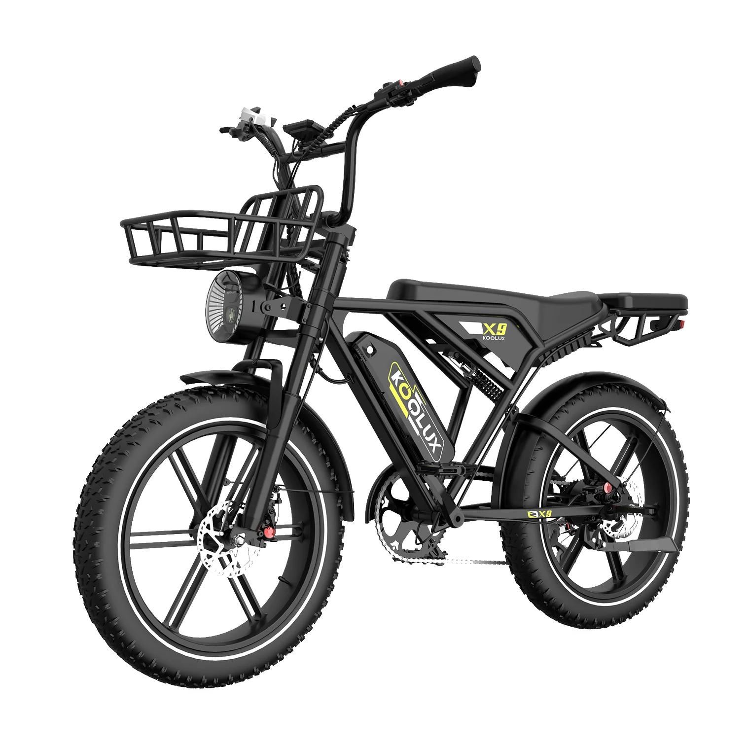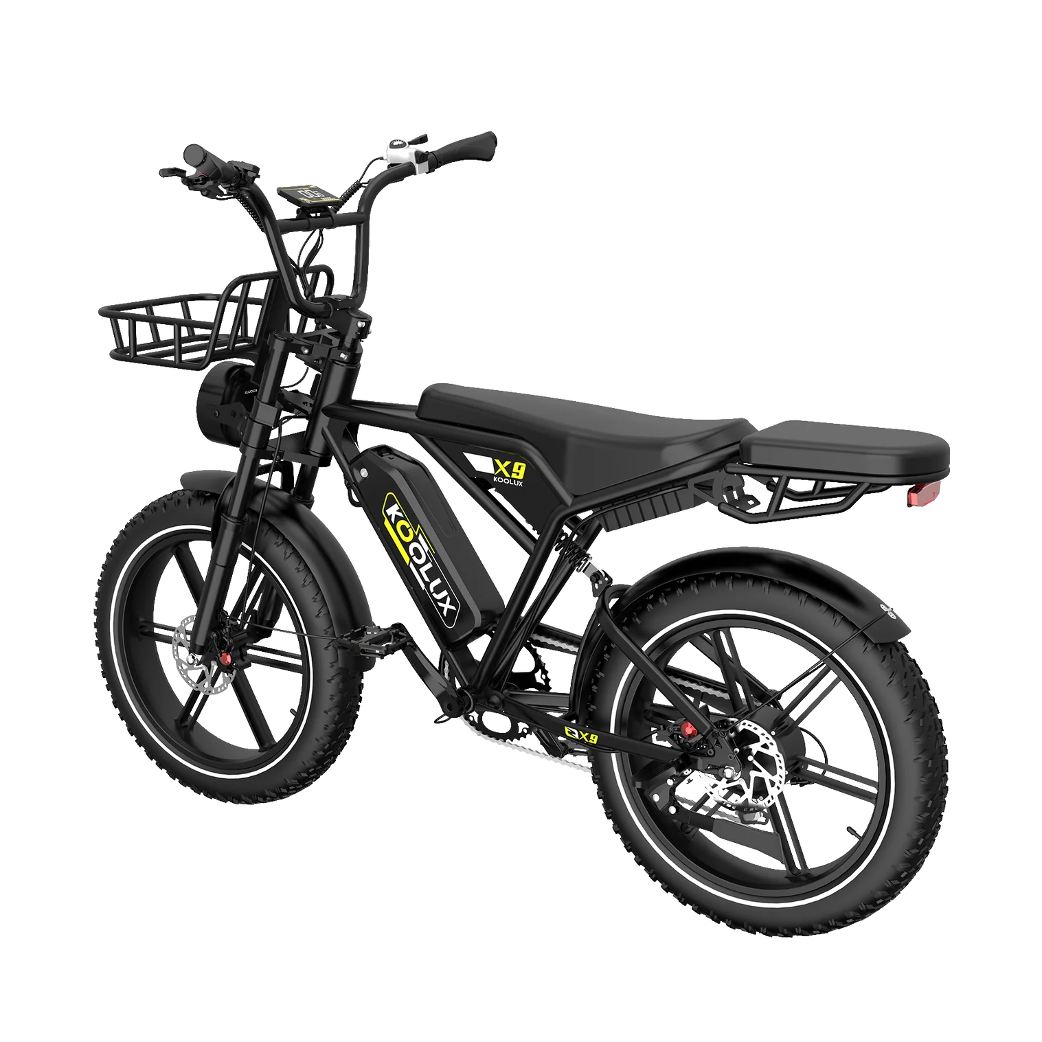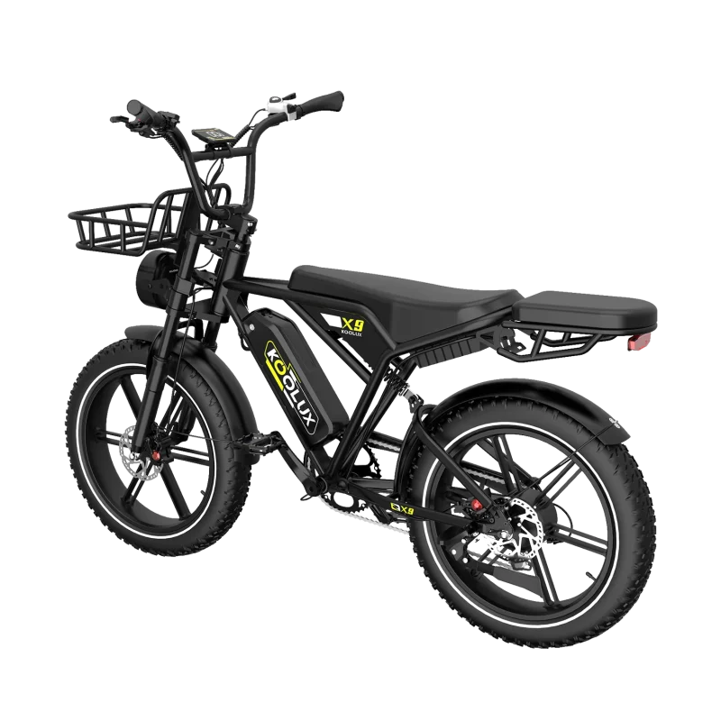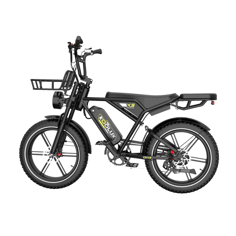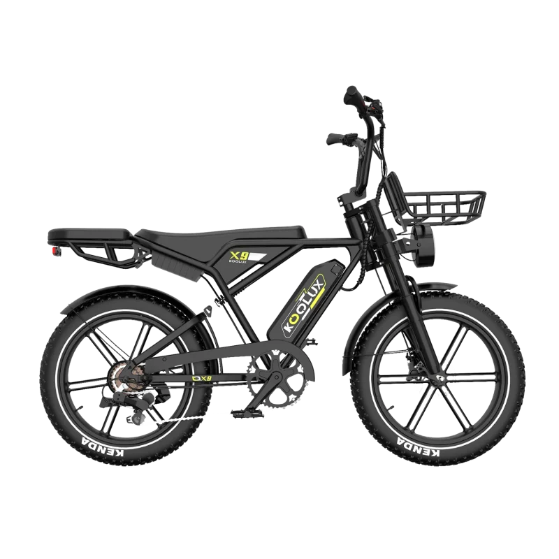 The KOOLUX X9 e-bike comes in a cool black color, blending modern style with reliable performance. Its 750W motor is paired with a high-capacity 48V 15.6Ah lithium-ion battery for a range of 60-80 kilometers on a single charge. Whether you’re commuting in the city or exploring scenic routes, the X9’s 20×4.0” built-up tires, fork suspension, Shimano 7-speed shifting system, and mechanical disc brakes ensure a smooth, safe ride on all types of terrain. An intuitive LCD display and integrated speed sensor keep you informed every step of the way. X9 is built on a sturdy iron frame for strength and durability. It’s the perfect companion for city trips and weekend adventures.