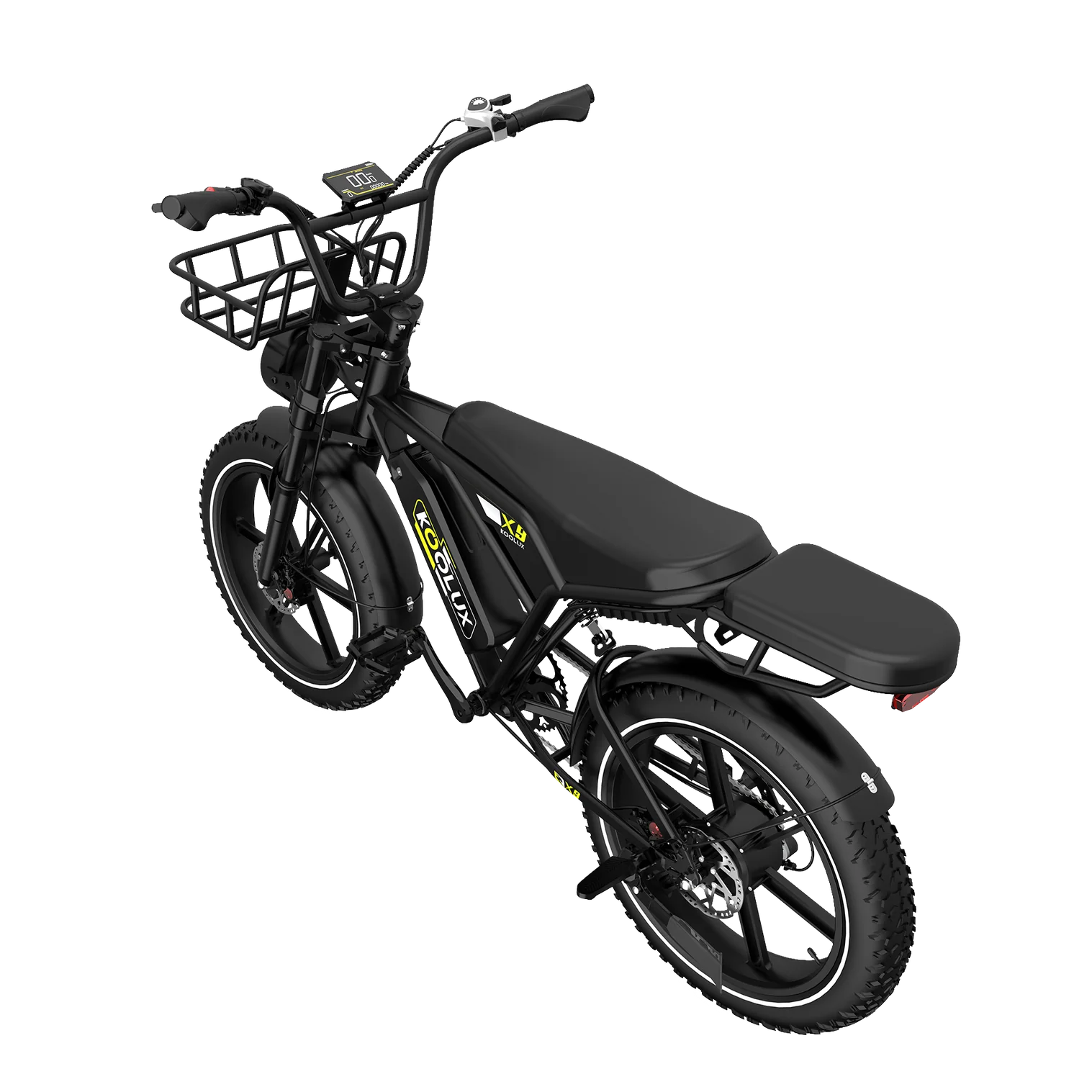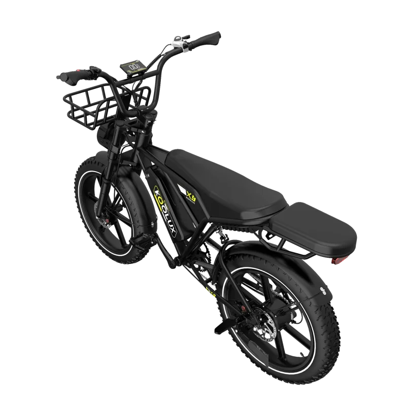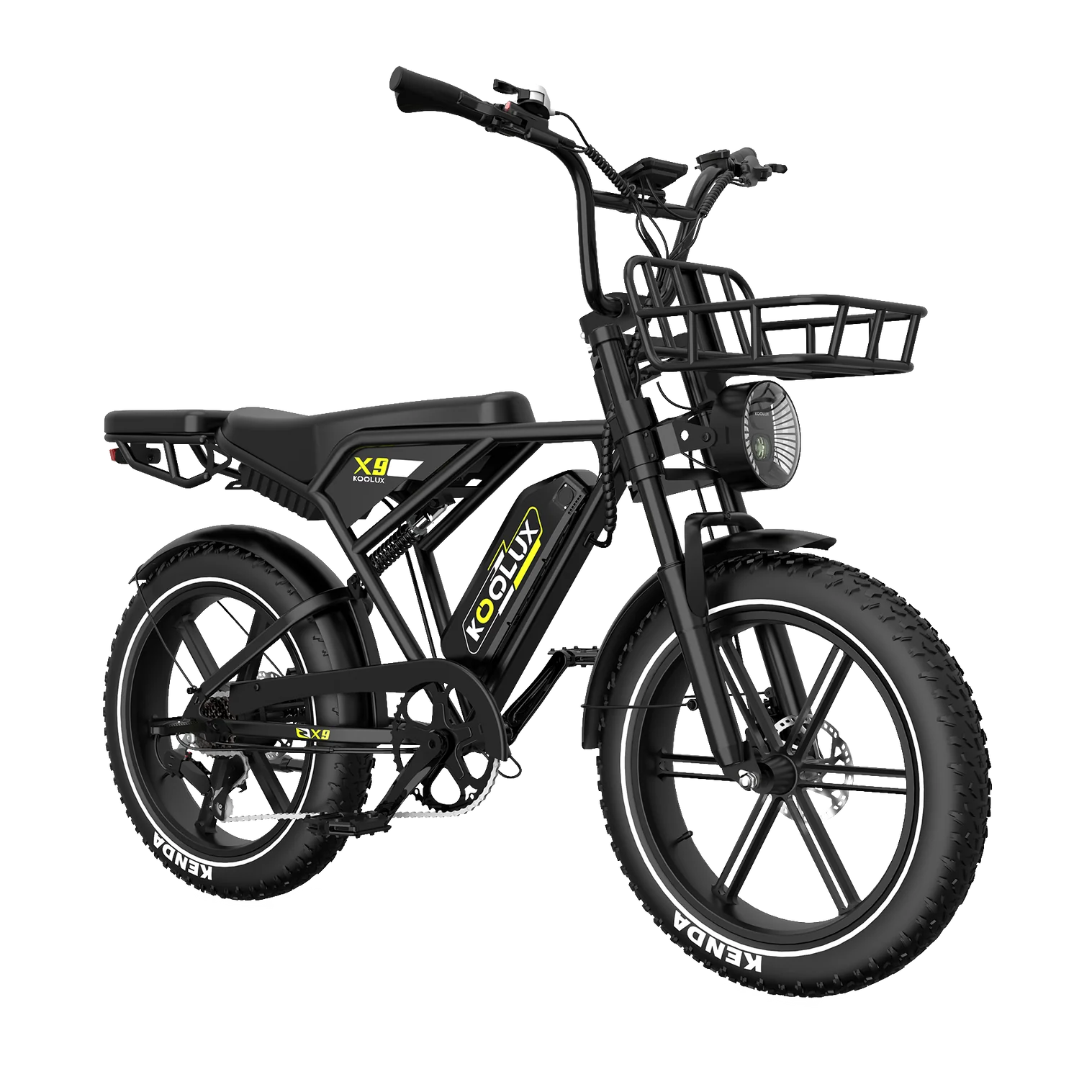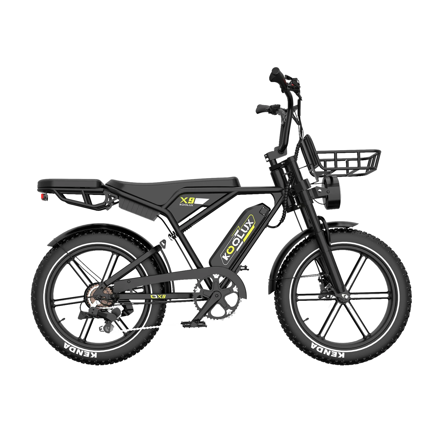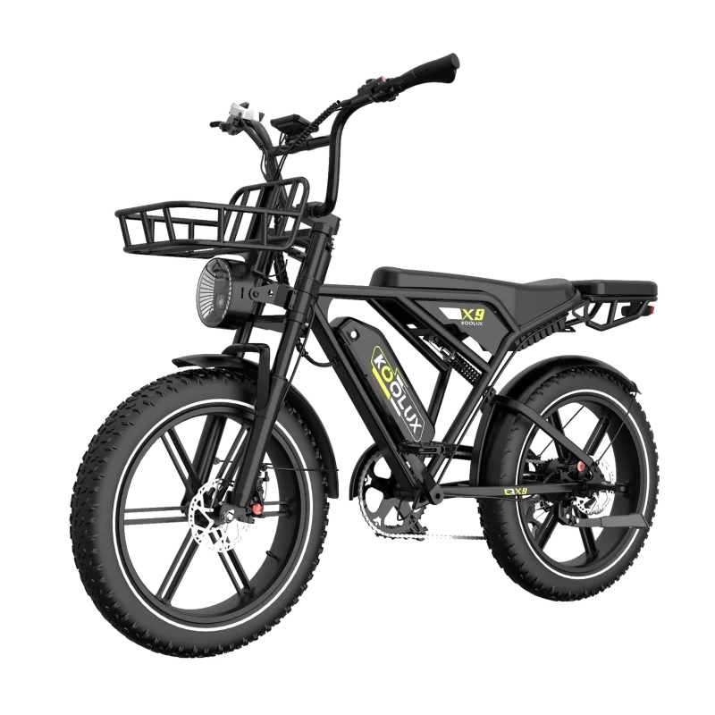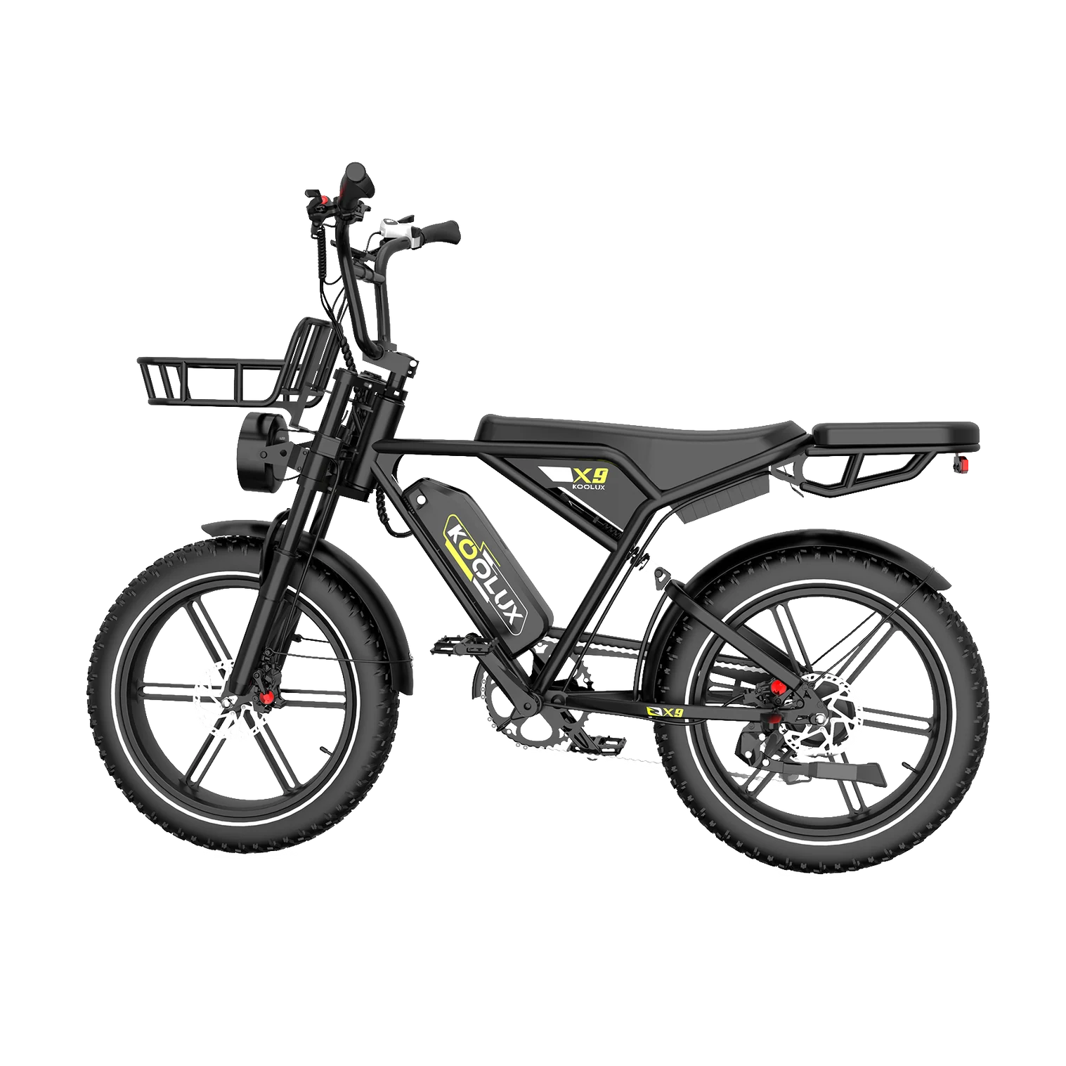 The KOOLUX X9 e-bike comes in a cool black color, blending modern style with reliable performance. Its 750W motor is paired with a high-capacity 48V 15.6Ah lithium-ion battery for a range of 60-80 kilometers on a single charge. Whether you’re commuting in the city or exploring scenic routes, the X9’s 20×4.0” built-up tires, fork suspension, Shimano 7-speed shifting system, and mechanical disc brakes ensure a smooth, safe ride on all types of terrain. An intuitive LCD display and integrated speed sensor keep you informed every step of the way. X9 is built on a sturdy iron frame for strength and durability. It’s the perfect companion for city trips and weekend adventures.