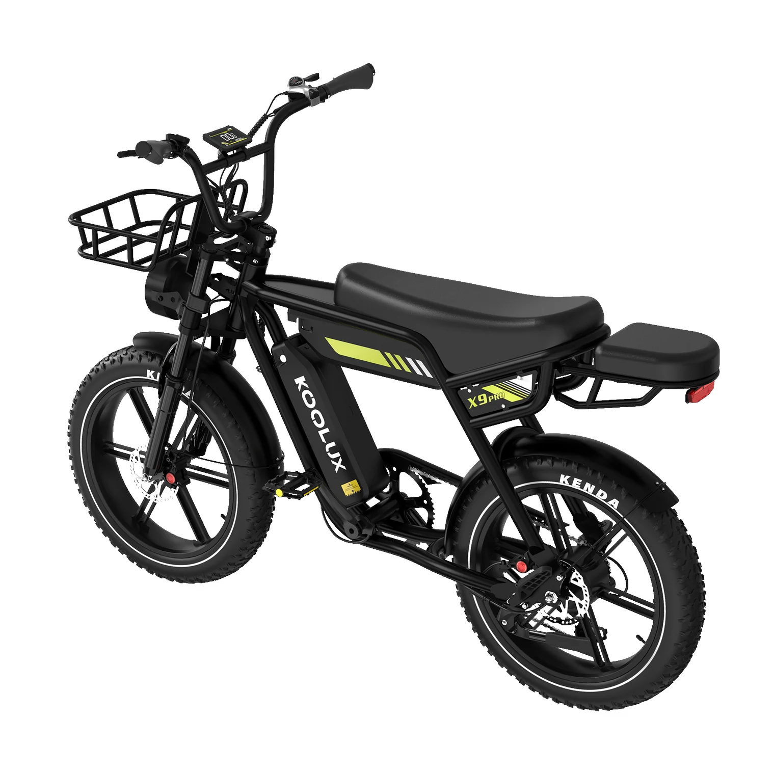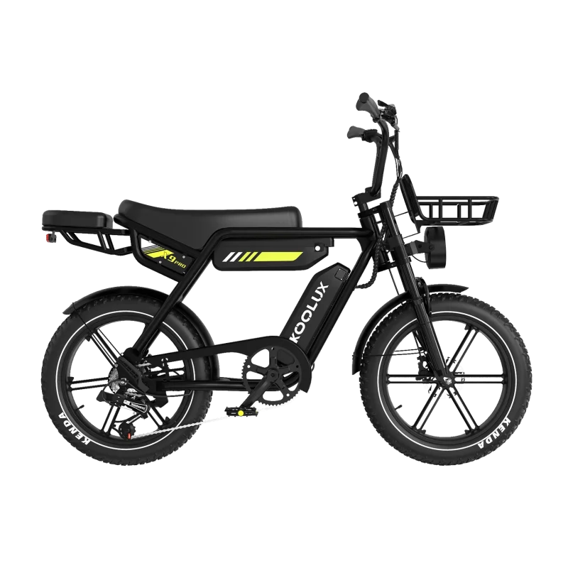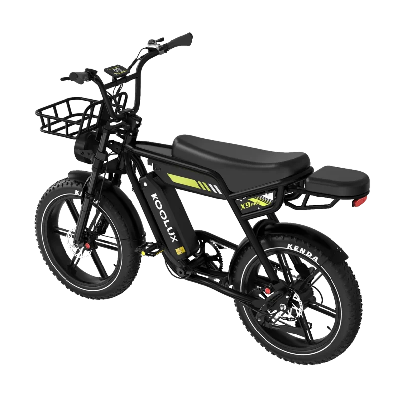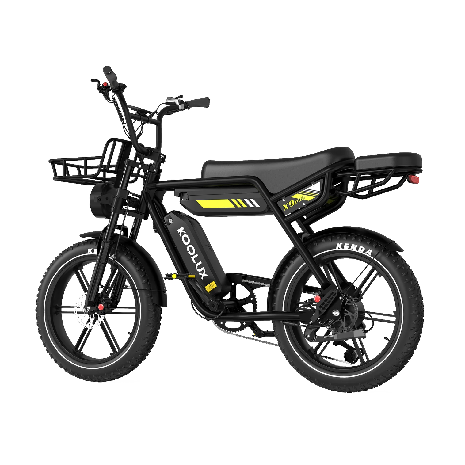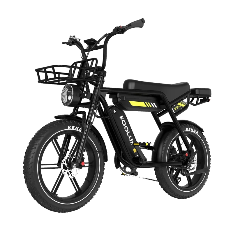 The KOOLUX X9 Pro e-bike comes in a cool black color, blending modern style with reliable performance. Its 750W motor is paired with a high-capacity 48V 31.2Ah lithium-ion battery for a range of 90-180 kilometers on a single charge. Whether you’re commuting in the city or exploring scenic routes, the X9’s 20×4.0” built-up tires, fork suspension, Shimano 7-speed shifting system, and mechanical disc brakes ensure a smooth, safe ride on all types of terrain. An intuitive LCD display and integrated speed sensor keep you informed every step of the way. X9 Pro is built on a sturdy iron frame for strength and durability. With a top speed of 45 km/h unlocked, it’s the perfect companion for city trips and weekend adventures.