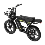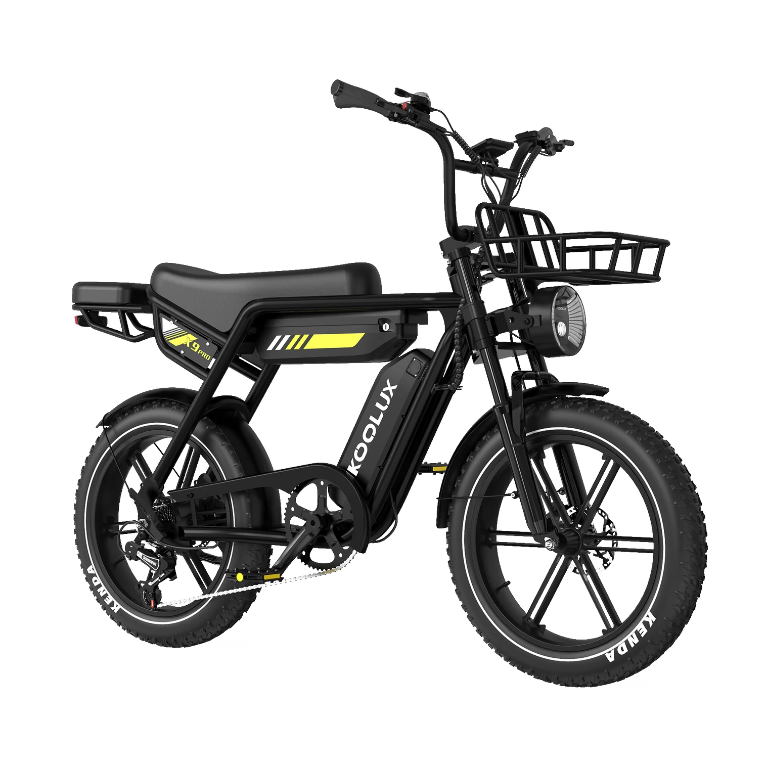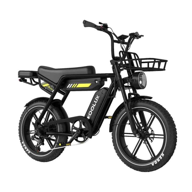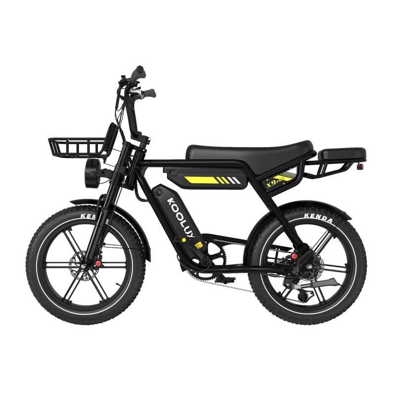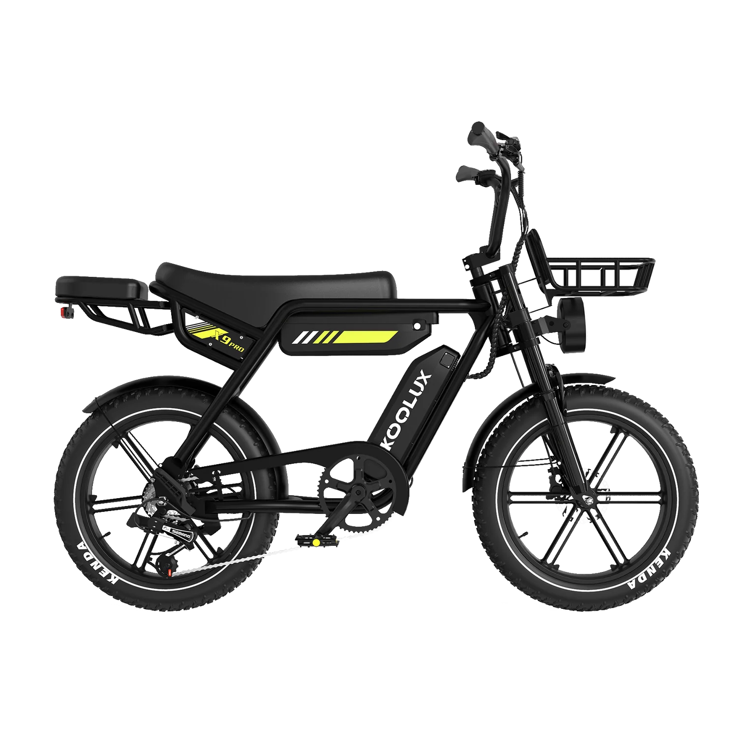 The KOOLUX X9 Pro e-bike comes in a cool black color, blending modern style with reliable performance. Its 750W motor is paired with a high-capacity 48V 31.2Ah lithium-ion battery for a range of 90-180 kilometers on a single charge. Whether you’re commuting in the city or exploring scenic routes, the X9’s 20×4.0” built-up tires, fork suspension, Shimano 7-speed shifting system, and mechanical disc brakes ensure a smooth, safe ride on all types of terrain. An intuitive LCD display and integrated speed sensor keep you informed every step of the way. X9 Pro is built on a sturdy iron frame for strength and durability. With a top speed of 45 km/h unlocked, it’s the perfect companion for city trips and weekend adventures.