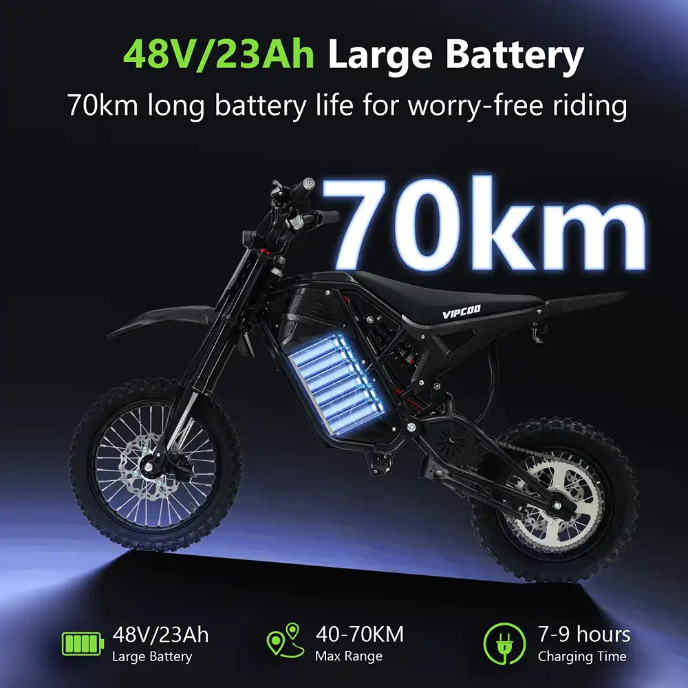 Equipped with a large 48V 23Ah lithium battery, the VIPCOO H3 offers an estimated 40–70 km riding range, depending on terrain, speed, and riding mode. This makes it suitable for longer off-road sessions and extended trail use.